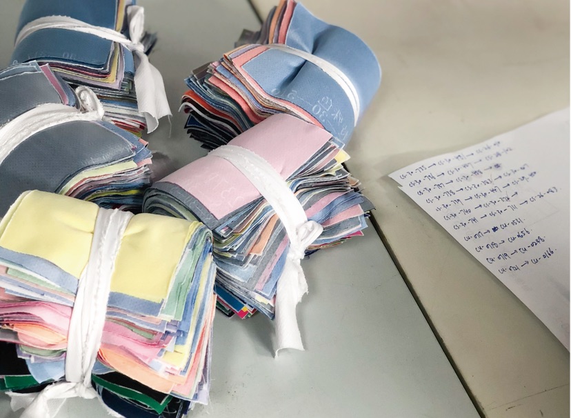 追加オーダーでできる限り同じ色を出すため、ベースのカラーチャートのみではなく全オーダーの色を社内で保管